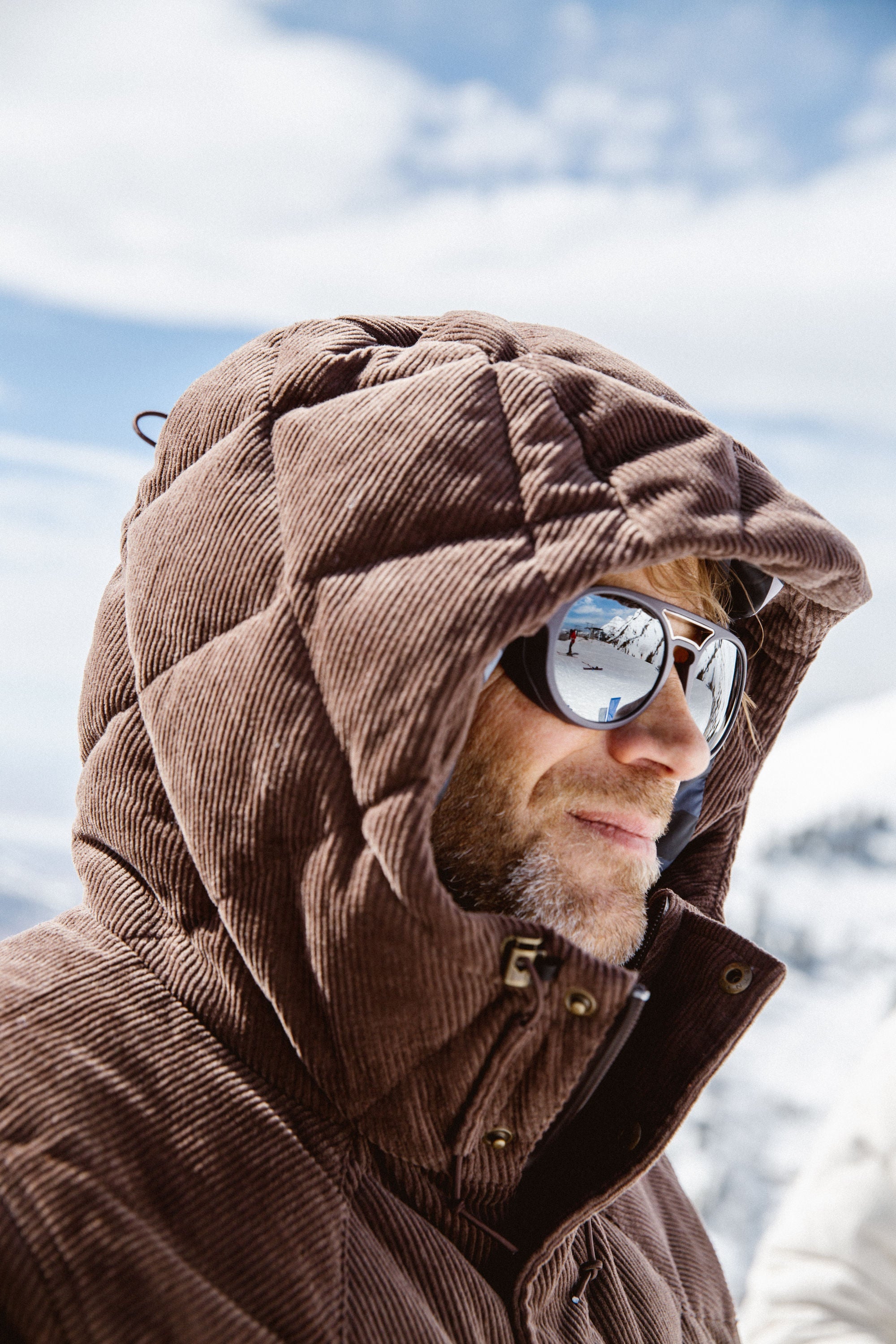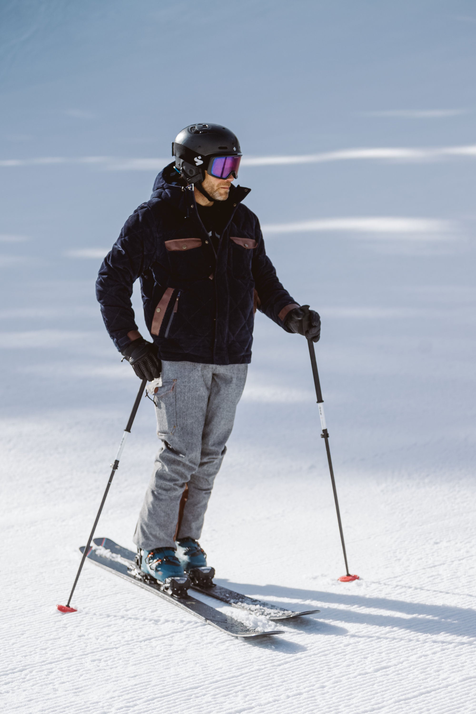 Waterproof corduroy, quilted down, and a "High West" graphic interior delivers a ski jacket that connects directly with the rustic roots of the classic mountains of the American West. A garment evoking the personality of skiing’s first western sportsmen, the High West Jacket offers warmth, comfort, and style for the gentleman skier seeking first-class quality and on-mountain performance.