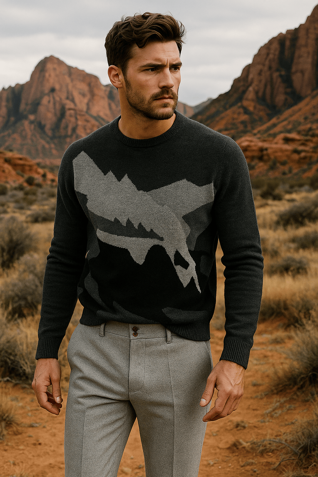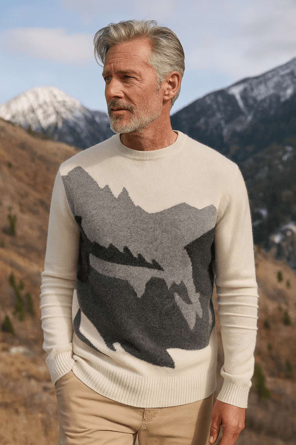 Blending cashmere and merino yarns, timeless personality, and a contemporary Wasatch Mountain Range graphic motif, this alpine sportswear garment commands a first-class expression representing the nostalgic mining town roots and ski-fashion culture of Park City, Utah.