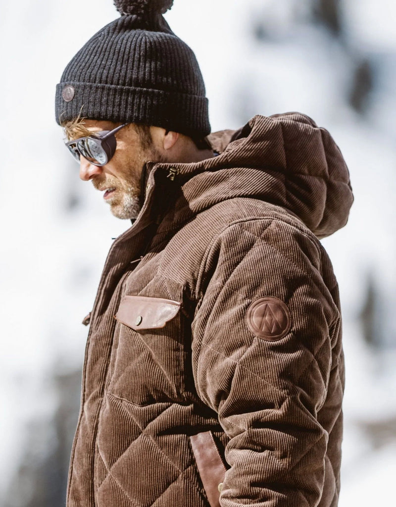 Waterproof corduroy, quilted down, and a "High West" graphic interior delivers a ski jacket that connects directly with the rustic roots of the classic mountains of the American West. A garment evoking the personality of skiing’s first western sportsmen, the High West Jacket offers warmth, comfort, and style for the gentleman skier seeking first-class quality and on-mountain performance.