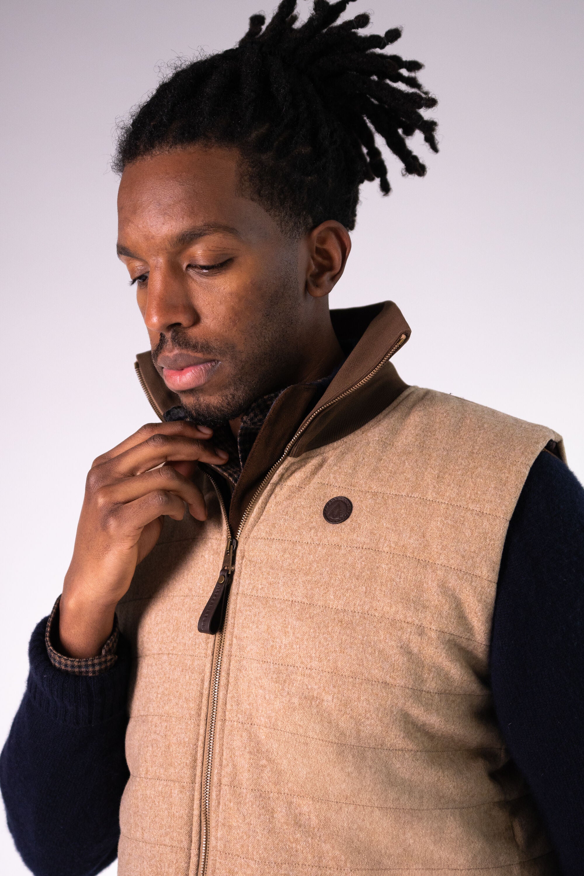 High taste, panache, and handsome sensibility describe Alps & Meters Schilthorn Vest. A garment for every season, the Schilthorn Vest commands first-class Italian craftsmanship, a richly baffled wool face fabric, with signature suede trim work designed to a high taste mixed medium of natural materials. Designed for the Gentleman Sportsman and Including the Alps & Meters signature mark at left breast, the Schilthorn Vest is an evergreen outerwear piece celebrating of the Kandahar Club’s sporting legacy and polished British origins.