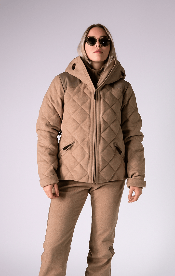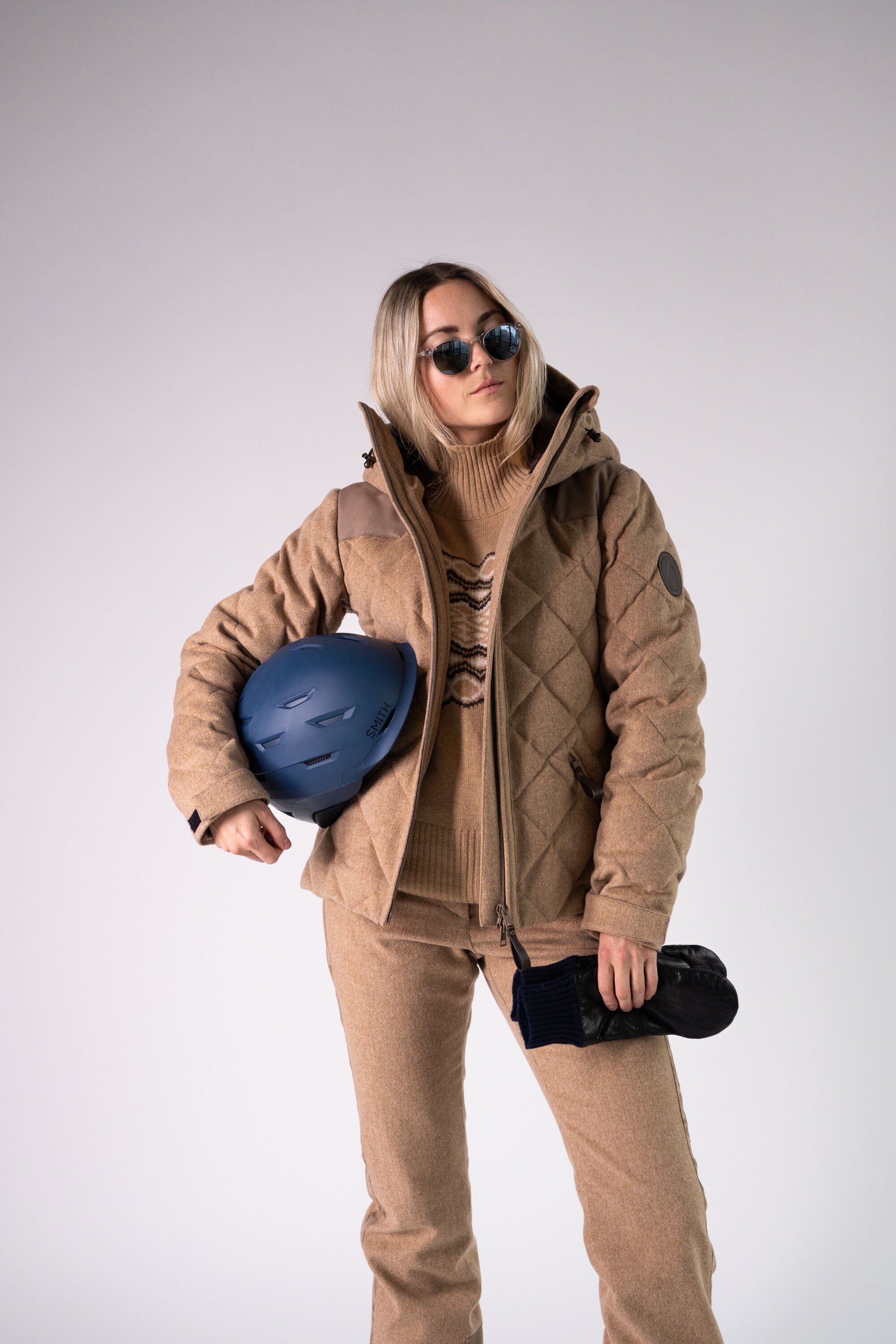 Royal families have been making annual ski trips since mountain resorts became desirable destinations of travel in the early 20th century. Much like hunting and tennis, skiing's dignified character provided a sporting outlet suitable for royalty and their desire to adhere to the upper crust norms of the day. Fueled by a lure of exotic mountain travel and the rise of the paparazzi, skiing quickly became the activity en vogue of high society and participation from many feminine cultural icons of the 1950’s quickly transformed ski slopes into fashionable runways of elegance and sophistication. Grace Kelly, Princess Alexandra of Greece, and Empress Farah of Iran all frequented Europe’s classic resorts where their taste and access to the finest fashion and well crafted winterwear helped give shape to a chic alpine sporting style soon adopted in the United States’ well-to-do destinations such as Sun Valley, Idaho and Aspen, Colorado. Made in Italy, Alps & Meters’ Sterling Jacket Italiana II is a luxury sportswear garment evoking the classic style of winter’s first royalty-come-celebrity whose exotic influence upon ski fashion of the past continues to inform the cache of the sports and its culture even today. Built in collaboration with the storied Loro Piana mill and utilizing the very finest performance wool fibers in the world, this special garment presents a luxurious expression of protection and style designed for winter’s royalty.