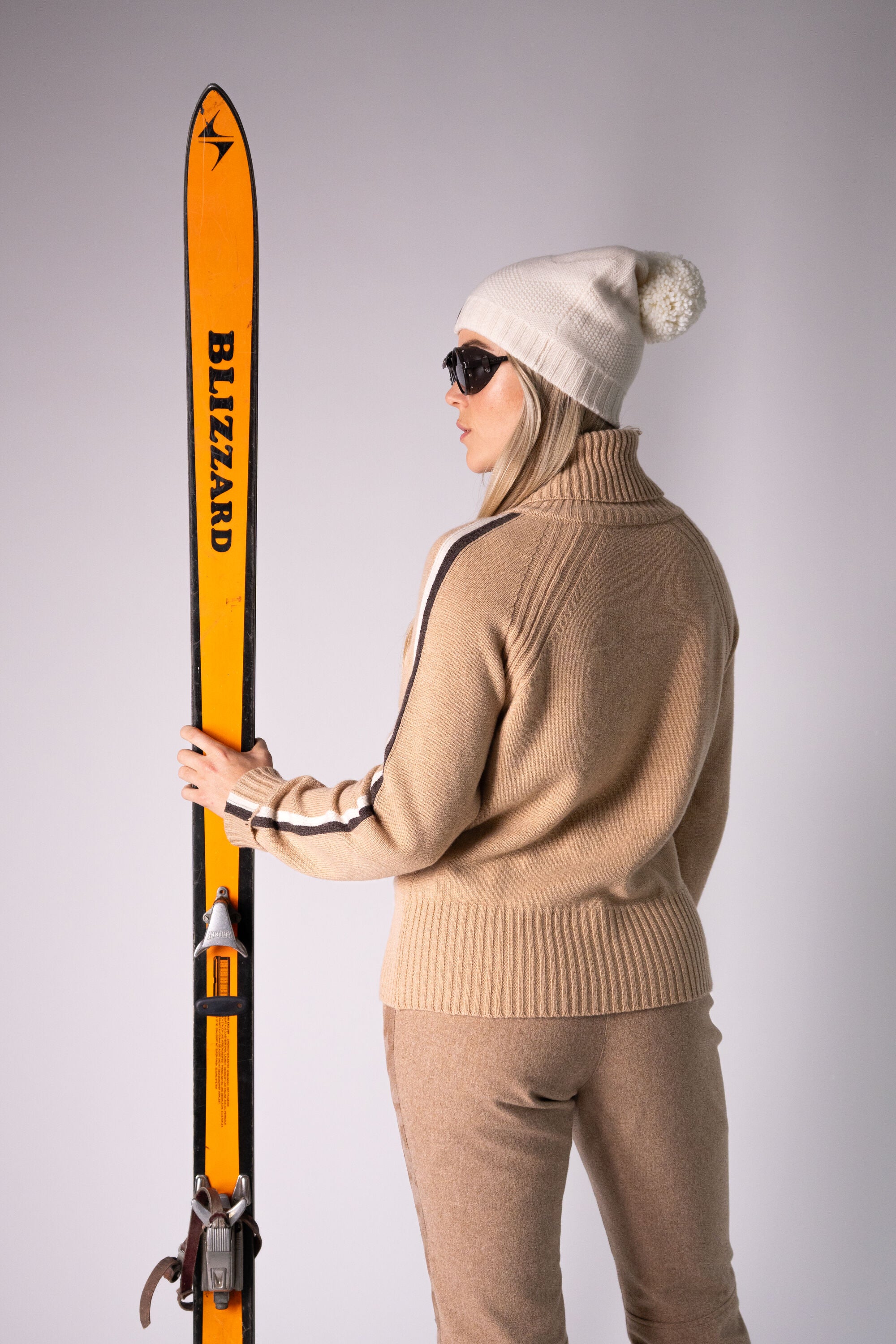Made in the Italy & woven from 100% cashmere fibers from the storied Boto Guiseppe mill, the W Ski Race Knit Downhill is designed with reference to original handmade knitwear worn by Europe's pioneering female skiers.  A traditional piece of mountain-wear with form fitting characteristics this luxurious sweater commands a first class expression representing the pure romance & timeless heritage of ski racing.