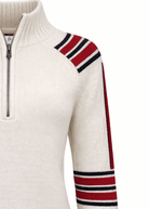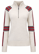 A sweater evoking the original racing kits worn by alpine sports first female pioneers of the mid-20th century.