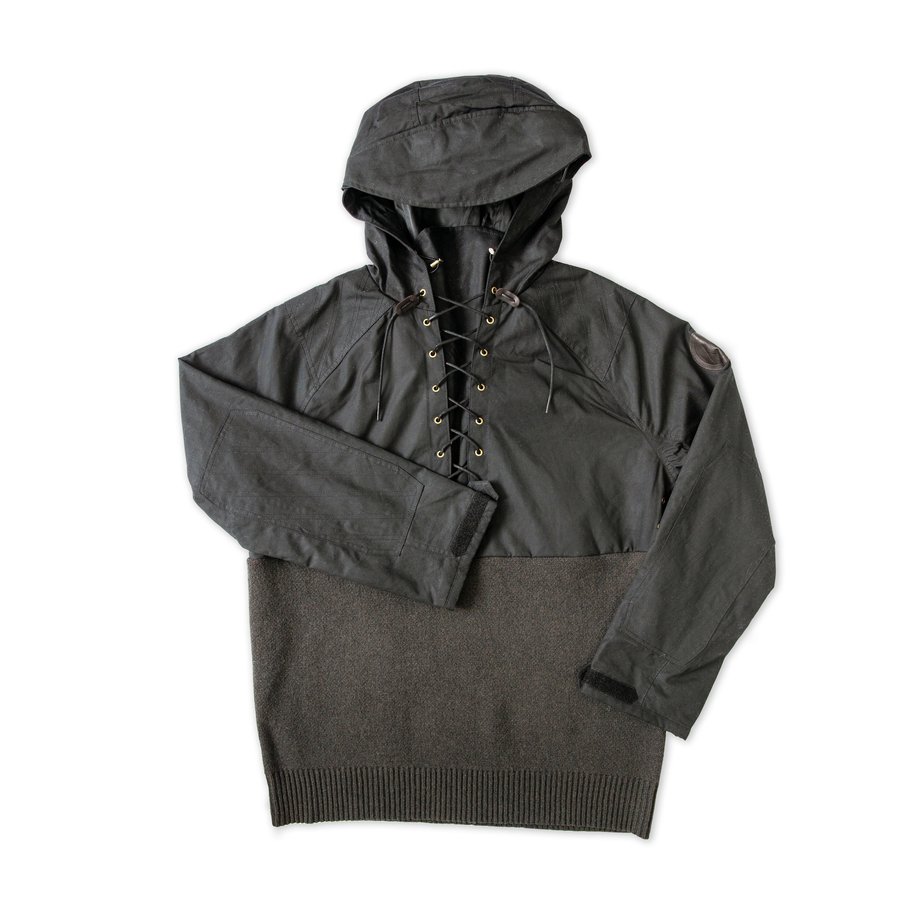 This 1-of-1 Mountain Memories Anorak Jacket is constructed from upcycled byproducts of the waxed cotton Alpine Anorak and the Ski Race Knit Patrol - creating a hybrid anorak-style pullover that delivers a nostalgic promise of hand-me-down protection and longevity.